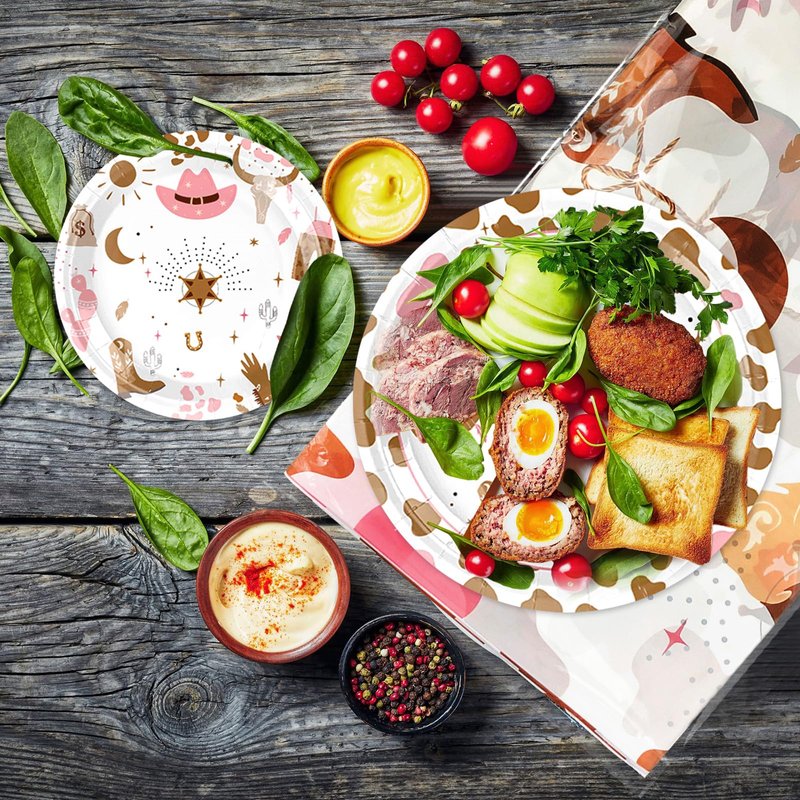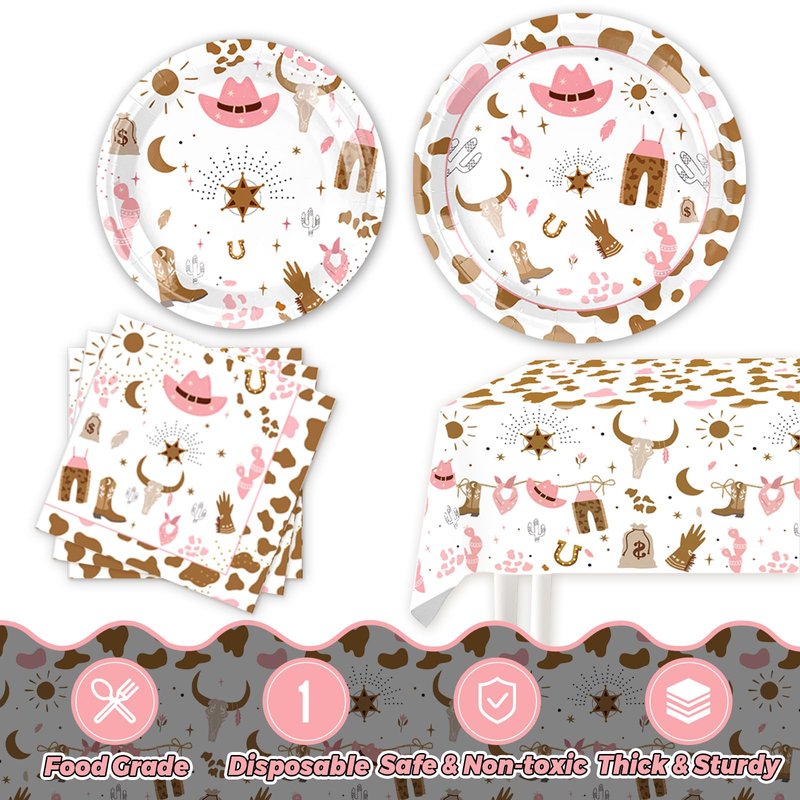 - [Giddy Up for Cowgirl Party Decorations]: Wild West Cowgirls! Are you ready to have great cowgirl party with our cowgirl party tableware? This delightful party set comes with all the essentials for cowgirl party and includes 20pcs 9'' cowgirl party plates, 20pcs 7'' western plates, 1pcs 86'' * 51'' western party tablecloth 20pcs paper napkins.