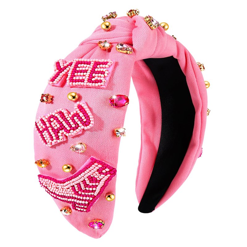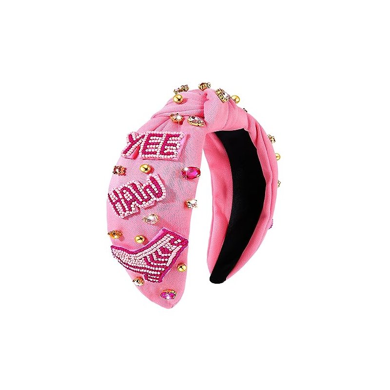 - ★ Western Knotted Headband: Let's go girls! Add some western flair to your cowgirl outfit with our pink knotted headband. This fashion Western headband features a top knot design, handcrafted beaded letter YEEHAW and beaded cowboy boot on both side, with gold beads, sparkling pink baroque crystal embellishments. The perfect western accessories to any Nashville bachelorette party outfit, country concert outfit, the rodeo outfit, birthdays, date nights, girls night out to show your Texas Pride