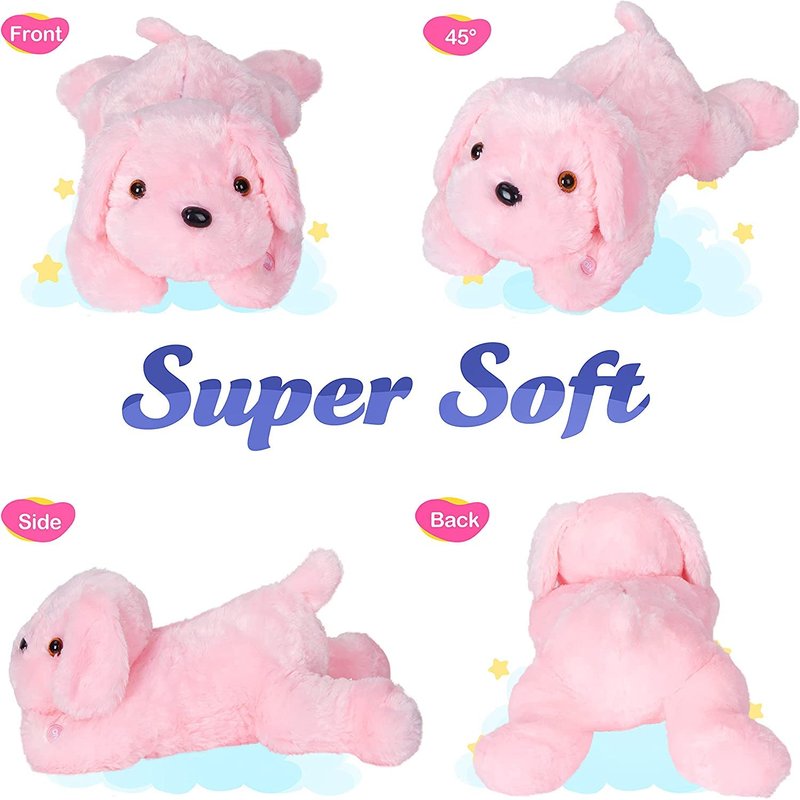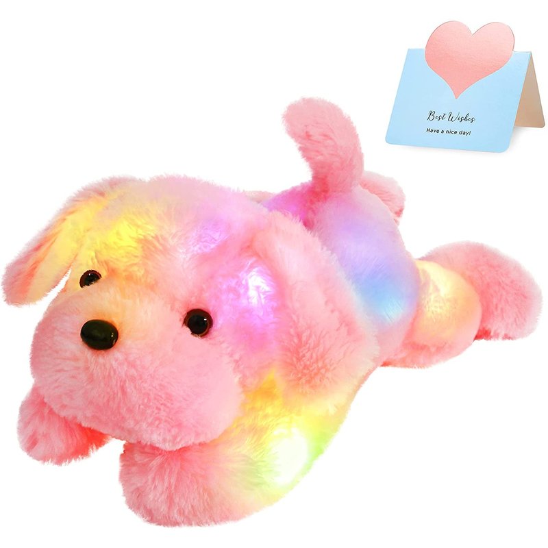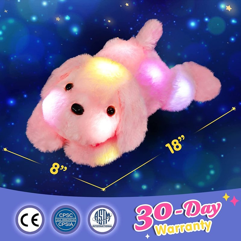- ADORABLE IMAGE OF PUPPY---This pink LED dog stuffed animal features a quiet crouching dog. Quite a lot of people are living with dogs, however, to those who loves dog but are allergic to the fur or kids who are too little to hug a four-leg friend with paws and fangs, this glow soft plush toy dog may be a good alternative.