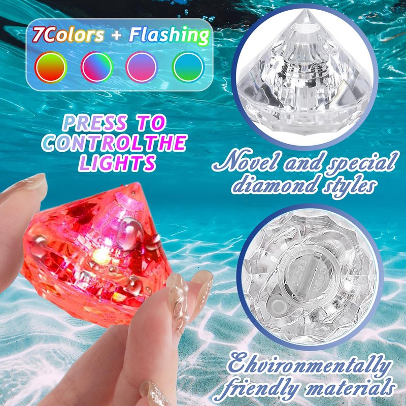 - Light pool toy :4 large diamonds with a switch, hold down the switch to light, release it and go out, there are 7 different colors, put into the water will automatically light, support light for about 18 hours