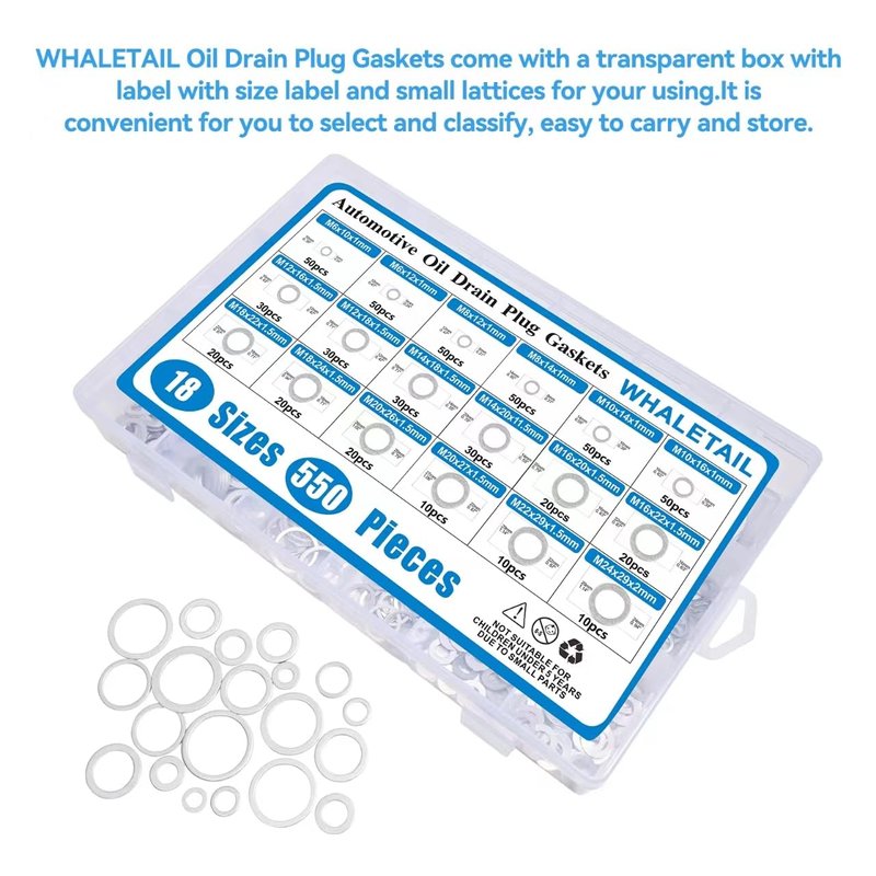 - 🚗【EASY TO USE】WHALETAIL Aluminum Oil Drain Plug Gaskets come with a transparent box with label with size label and small lattices for your using.It is convenient for you to select and classify, easy to carry and store.