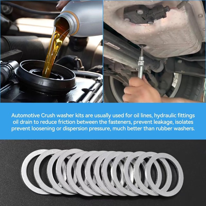 - 🚗【Oil Drain Plug Gasket Function】Automotive Crush washer kits are usually used for oil lines, hydraulic fittings, oil drain to reduce friction between the fasteners, prevent leakage, isolates, prevent loosening or dispersion pressure, much better than rubber washers.