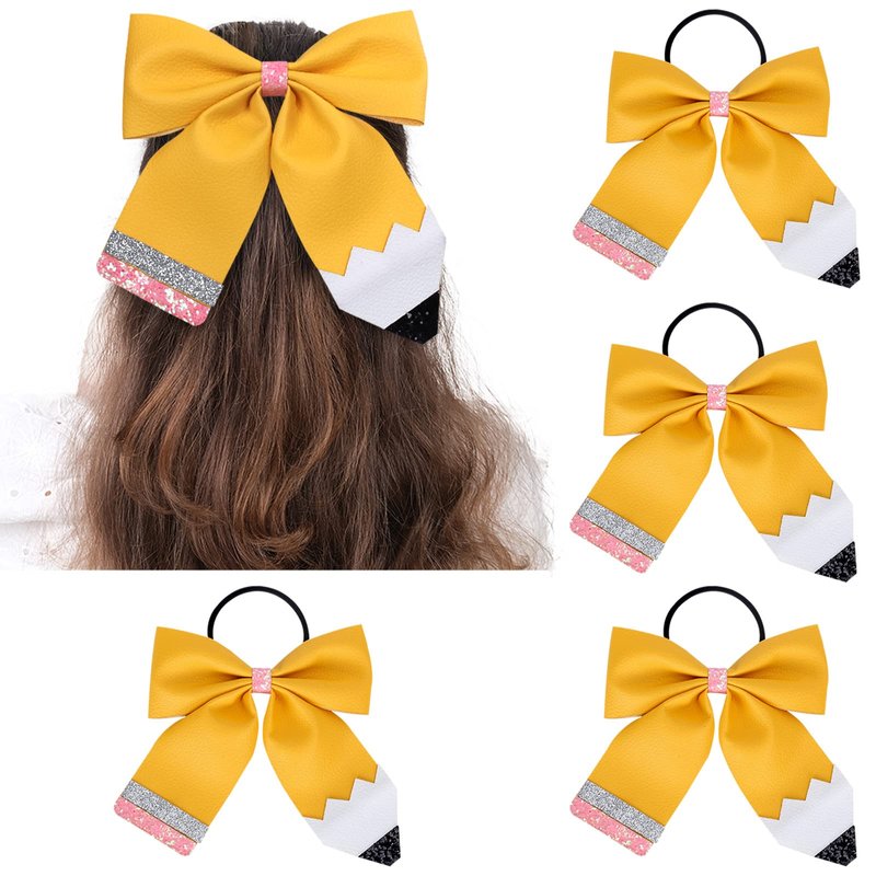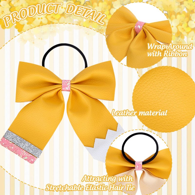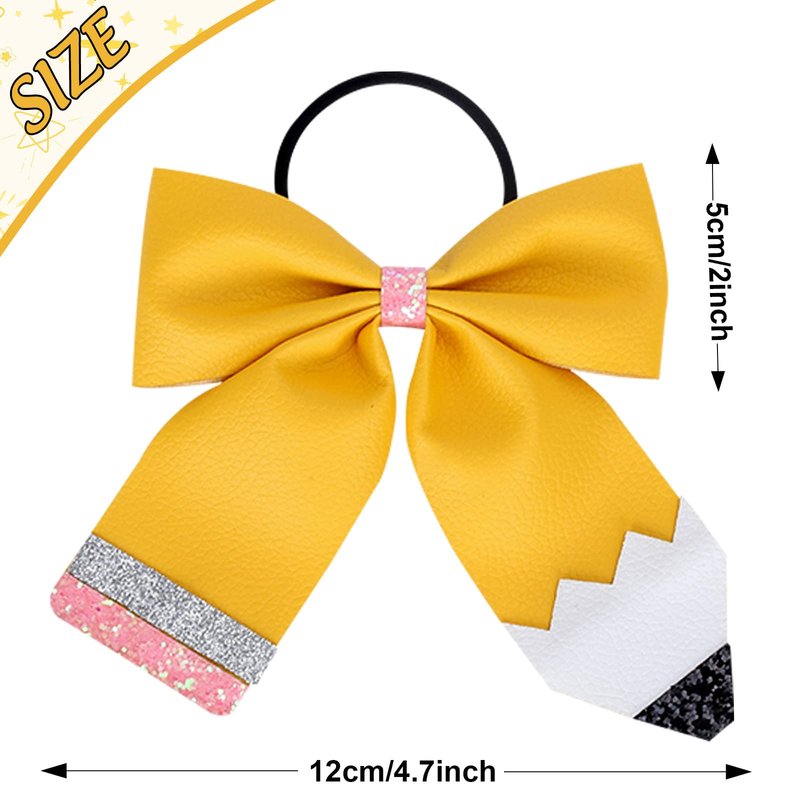4 pieces quality leather material back to school pencil cheer hair bows with sturdy elastic headband, sufficient for you to spare or replacement, meeting your different holiday dressing needs.