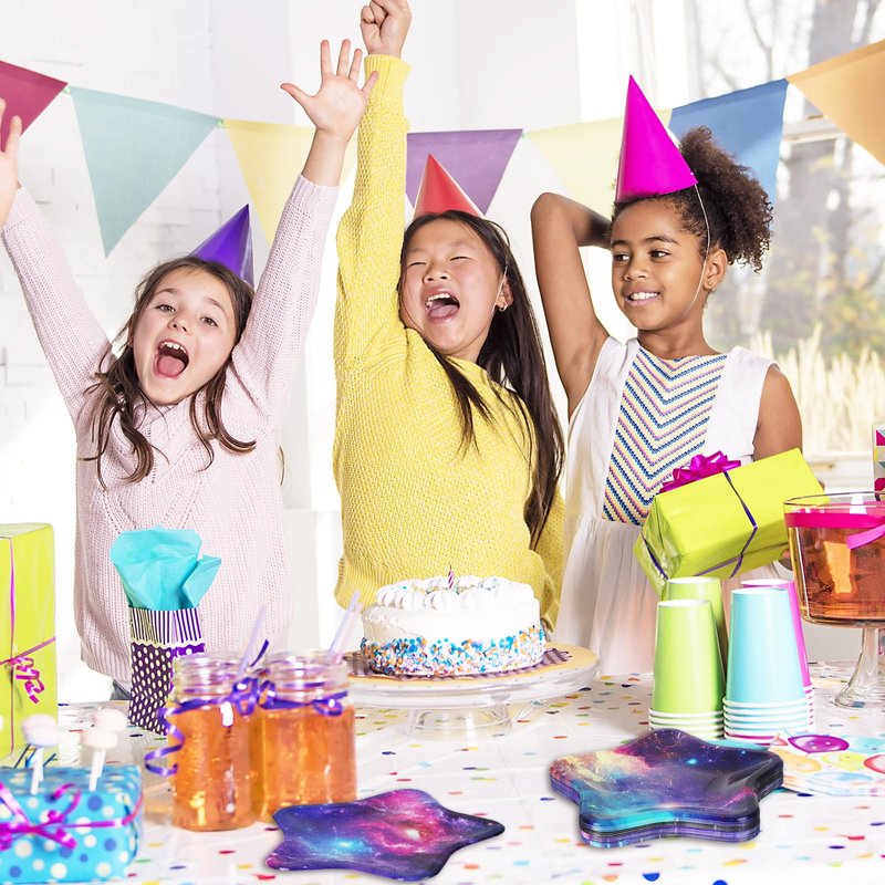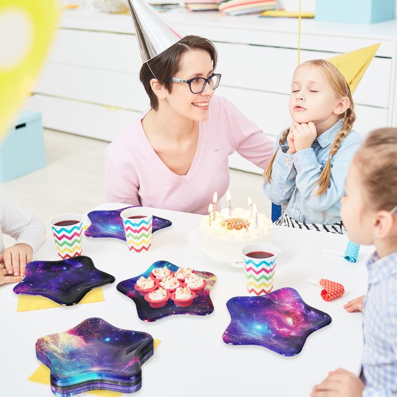 Designed as star shape and printed with galaxy, space and stars, reliable and disposable, suitable for many occasions, can well add a happy atmosphere to the party.