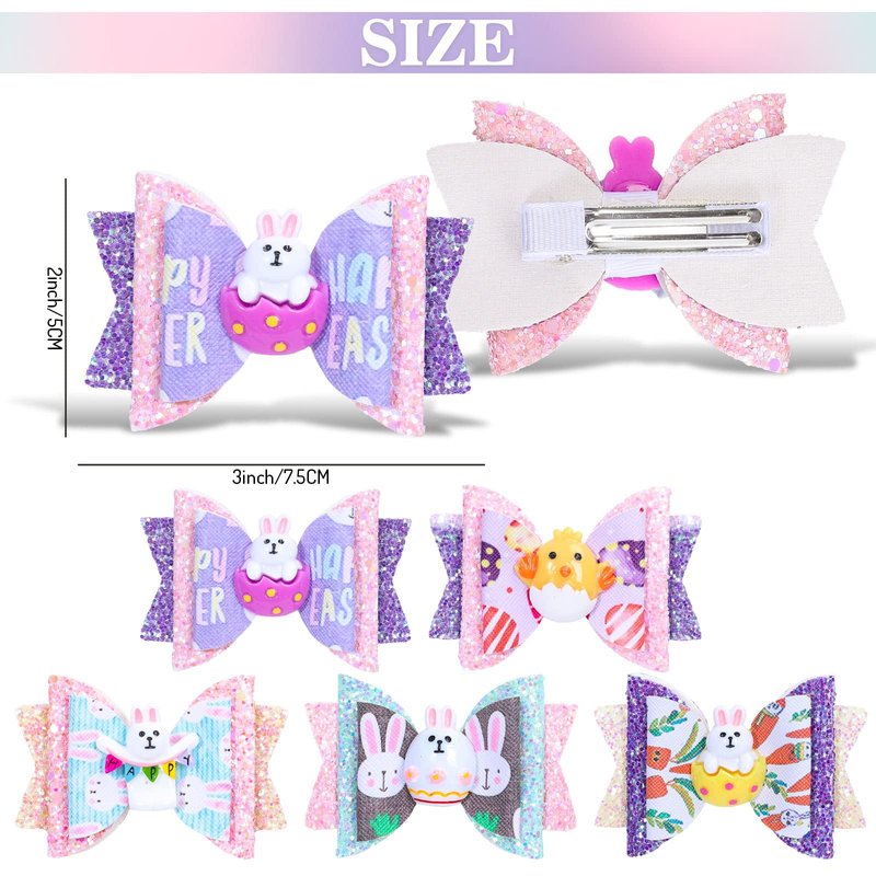 5 pack Easter hair bow clips, made of good quality glitter leather material, looks beautiful and exquisite. Help girls fix and decorate their hair.