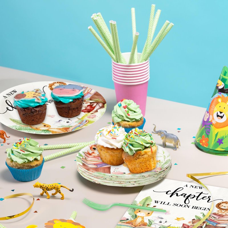 Features & Benefits: The tableware set contains napkins, forks and plates in 2 sizes, suitable for 24 guests, great for you to use Showing the sense of new beginning with cute storybook elements, all the contains are quality and disposable, suitable for many occasions, can well add an joyful atmosphere to the party Specifications: Material: paper Size: Plates: 9 inch and 7 inch Napkin: 6.5 x 6.5 inch (folded) Fork: 6.3 inch Package includes: 48 x paper plate 24 x paper napkin 24 x plastic fork