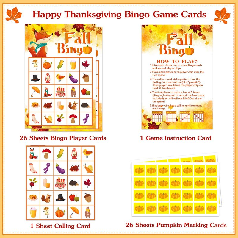 • 【Autumn Bingo Game Cards Set】:Package includes 26 sheets fall festival bingo player cards, 26 sheets 728pcs bingo pumpkin cards, 1 calling card and game instructions cards.