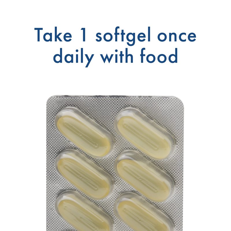 - Take 1 softgel once daily with food, preferably with a meal rich in fatty acids such as olive oil or yogurt