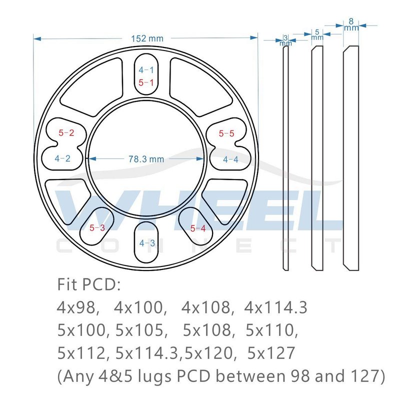 - Outer Diameter:152mm, Inner Daimeter:78.3mm, Thickness 8mm (5/16"). Fit most of the wheels of 4 or 5 lugs , PCD from 98 to 127mm, pack of 2 pcs.