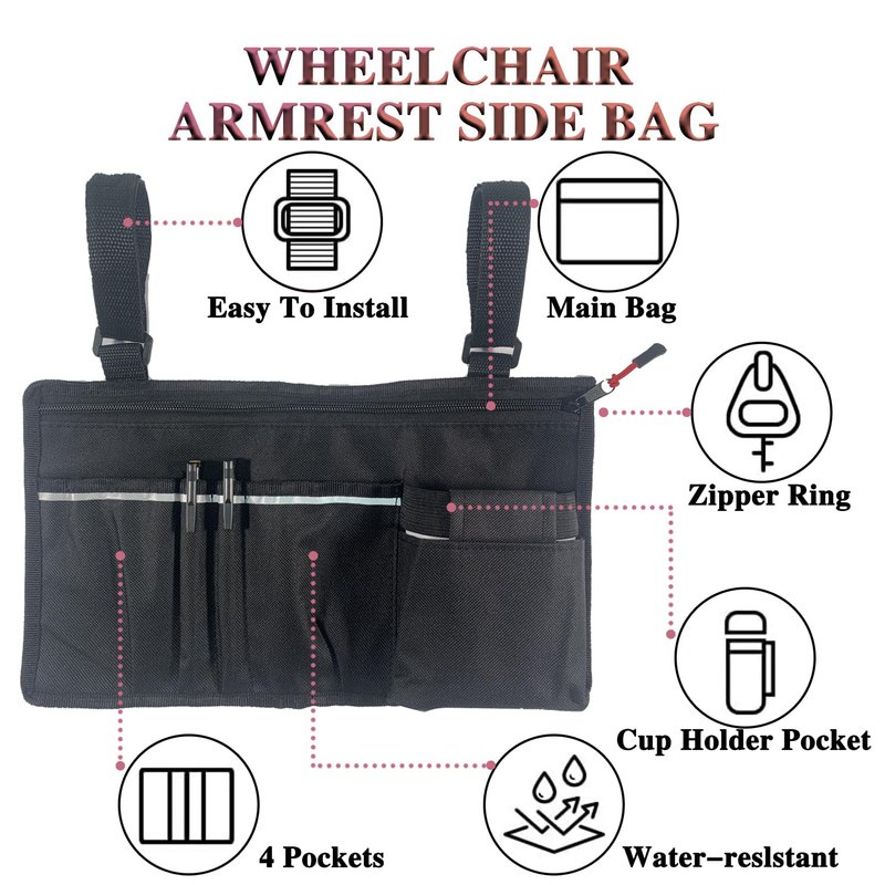 - ✅[Durable and lightweight] Double seam at the seam of the side wheelchair bag to strengthen the stress point. Made of heavy-duty nylon, this armrest organizer wheelchair is durable and can withstand years of daily use. To clean, simply wipe the waterproof nylon with a damp cloth.