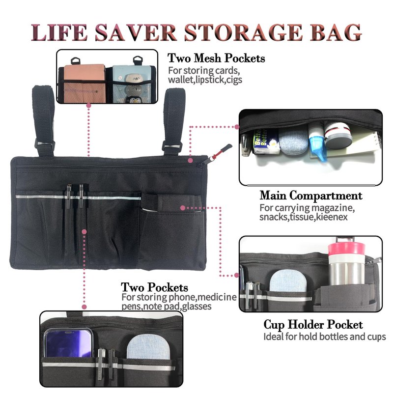 - ✅[Perfect for standard wheelchairs] Has 2 front pockets, a zipper compartment and 2 rear mesh pockets. The armrest bag has two 13.3-inch straps that fit inside or outside of electric wheelchairs, walkers, rollers, scooters, mobility chairs and rollers.