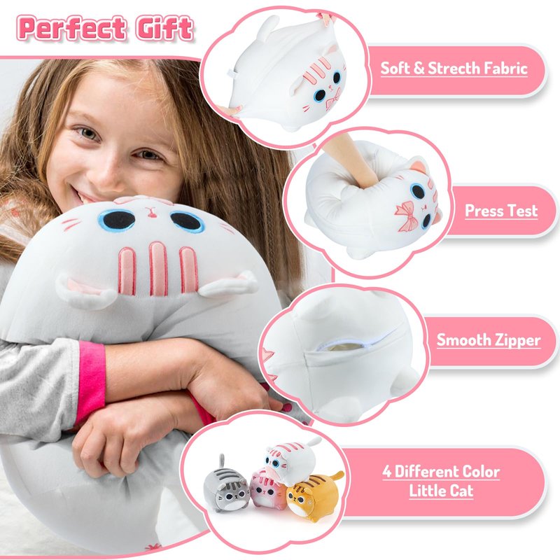 - 🌈【Safety, Softness & Durability Material 】Our cat plushie pillow is crafted from stretchy super soft fabric filled with with plump pp cotton, which is softer than ordinary, when hold it in your arms, you will feel comfortable and elastic, with a smooth feel and delicate texture. Our fabrics of this kawaii cat plush pillow have passed CPSIA certification ensuring safety. Moreover, our meticulous stitching process enhances this cat pillow toy's durability and prevents loose threads.