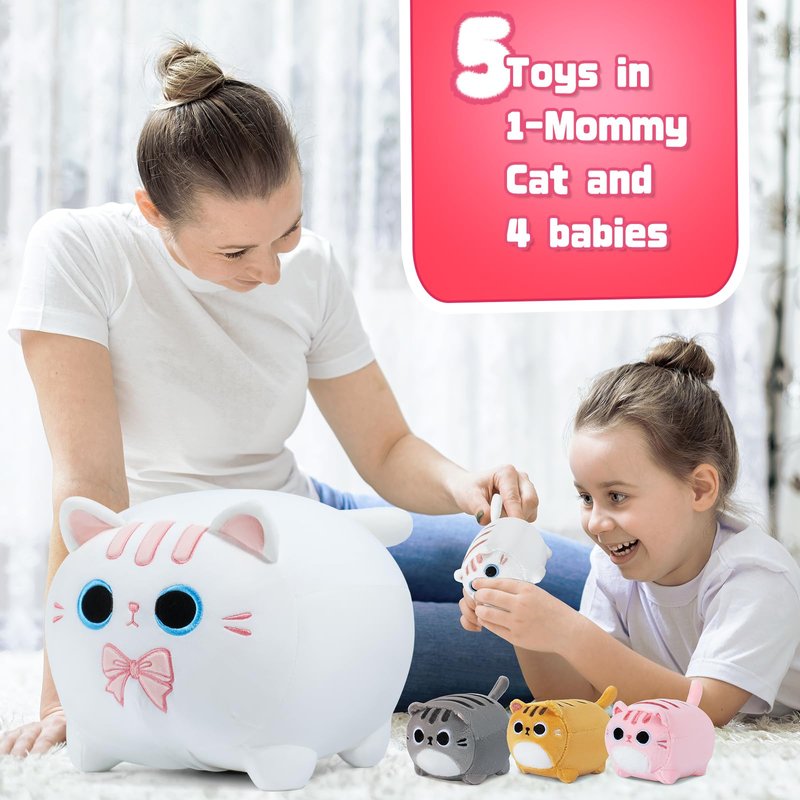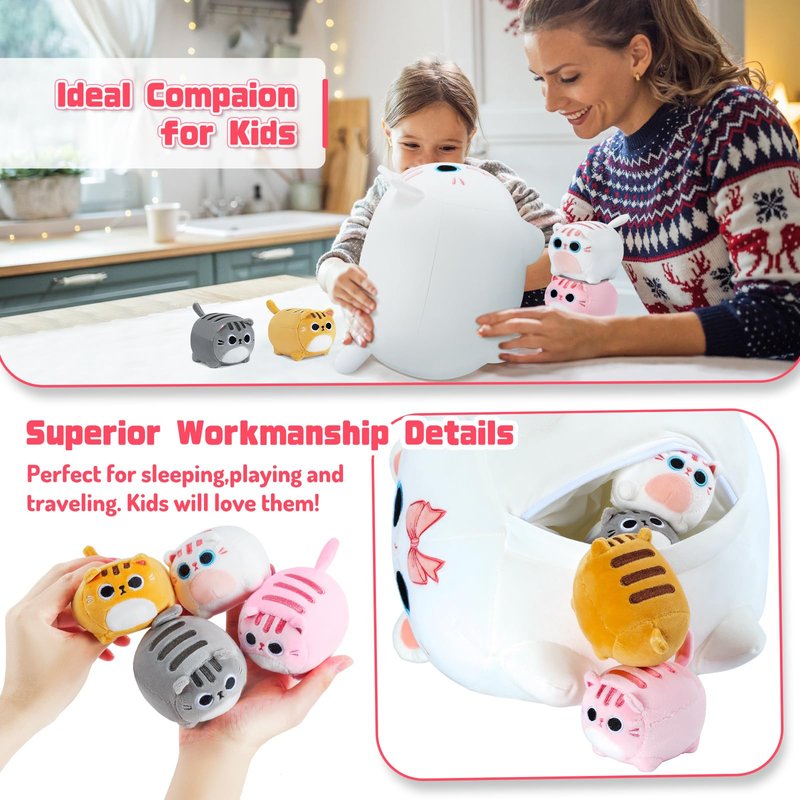 - 🐈[Cat Family Design]: This is a Lovely cat Family set with a total of 5 plush toys, including Cat Mommy+4 Kitty. The Cat Mom has a zipper on her abdomen, When you open the zipper, you will see four cute cat Babies with different colors and expressions. With them, you will have five times the happiness.