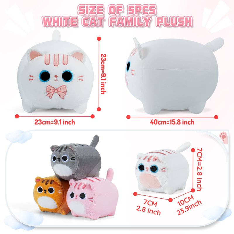 - 😺【5 Toys in 1 Cat Family】Size of Mommy-15.8 Inch:15.8"x9.2" x8", This kawaii cat stuffed animal plush body pillow with much larger size then ordinary size. They are bigger and plumper than you imagine, will bring you fully envelopment. The size of our cat plush toys are suitable for adults and children to grab and hug. When you are in a bad mood, you can squeeze the plush cute cat pillow to relieve work stress.