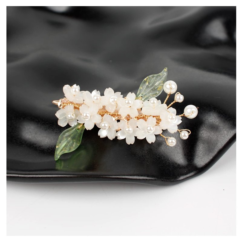 The small white flowers on the hair clip are tightly wrapped around the clip with a golden metal wire, which is not easily loose. The flowers bloom in different directions, making it very lively and lovely.