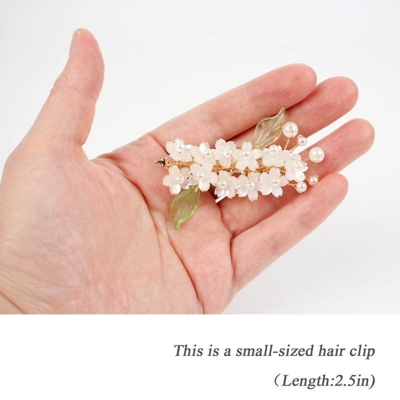 Cute flower hair clips.This is a small-sized hair clip, measuring 2.5 inches in length, which is very delicate. The hair clip is covered with blooming white flowers, greatly enhancing its texture and beauty.