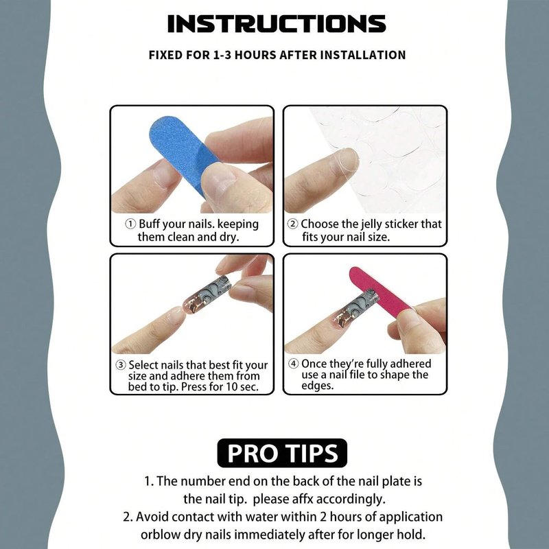 • 【Easy to use】Just choose the nail piece that suits you,polish the nail bed,paste the jelly glue we give you,and then press the nail for 30 seconds to get your favorite style nail. Due to the limited use of jelly glue, we suggest you use your own glue.(The fake nails will stay longer if you clean your nails before use,and avoid water within the first hour of wearing)