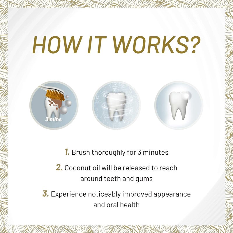 - Coconut Oil Whitening: Infused with luxurious coconut oil to gently whiten teeth and remove stains