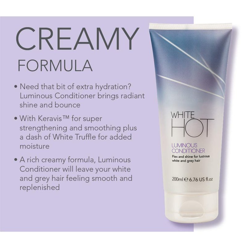 Set includes: White Hot Brilliant Shampoo 200ml: Brightening boost to light up white and grey hair as and when you need it. Use once or twice a week or when your grey or white hair needs a super-charged boost to banish dull and yellowy tones. To use: Massage into wet hair for a luxurious lather then rinse thoroughly. White Hot Glorious Shampoo 200ml: An everyday, shine-giving cleanse for white and grey hair. With a detoxing complex to neutralise shine-dulling pollutants and a luxurious touch of White Truffle known for its moisturising properties. To use: Massage into wet hair for a luxurious lather then rinse thoroughly. White Hot Luminous Conditioner 200ml: A rich and creamy conditioner for lustrous flex and shine. With smoothing and strengthening Keravis for bounce and shine and moisturising extracts of White Truffle. To use: Squeeze out any excess water after shampooing and smooth through damp hair to the ends, then rinse thoroughly.