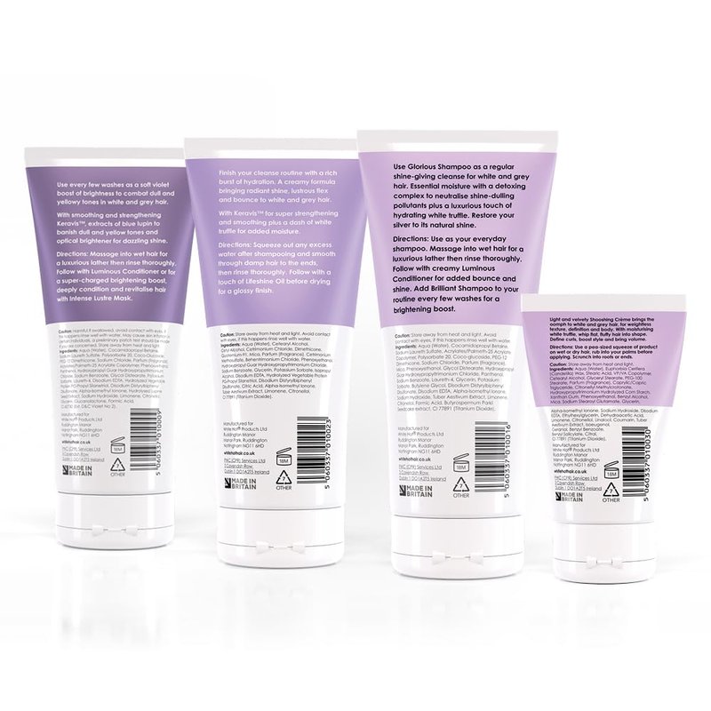 White Hot Short Hair Quartet, brightening hair care regime with texturising styling cream for shorter white & grey hair, purple shampoo