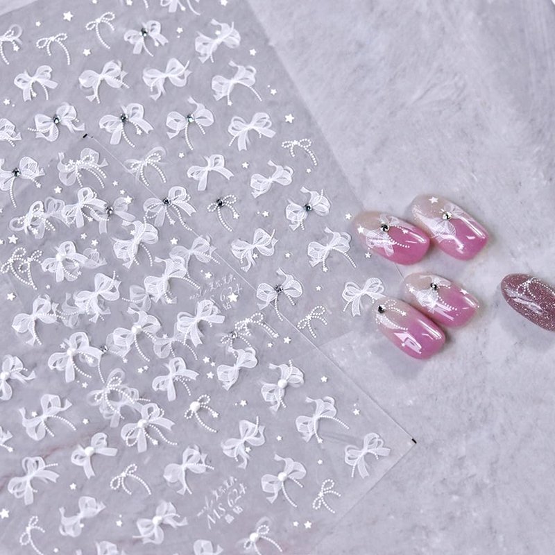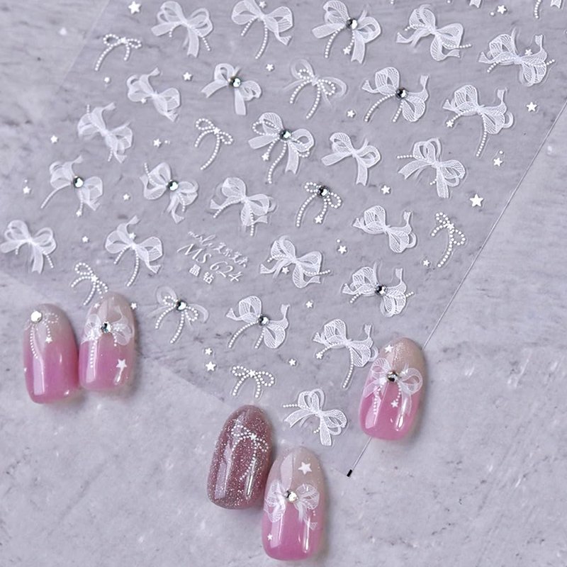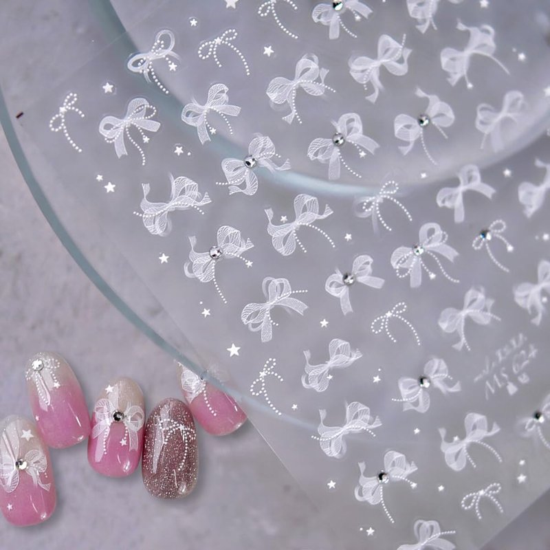 - 【5D Embossed Bow Nail Stickers】Cute sweet crystal white ribbon bow nails stickers are quite delicate and textured, that will not fade,look more realistic than regular nail stickers, and these exquisite relief bows with pearl are great for creating more detailed and delicate nail art effect.