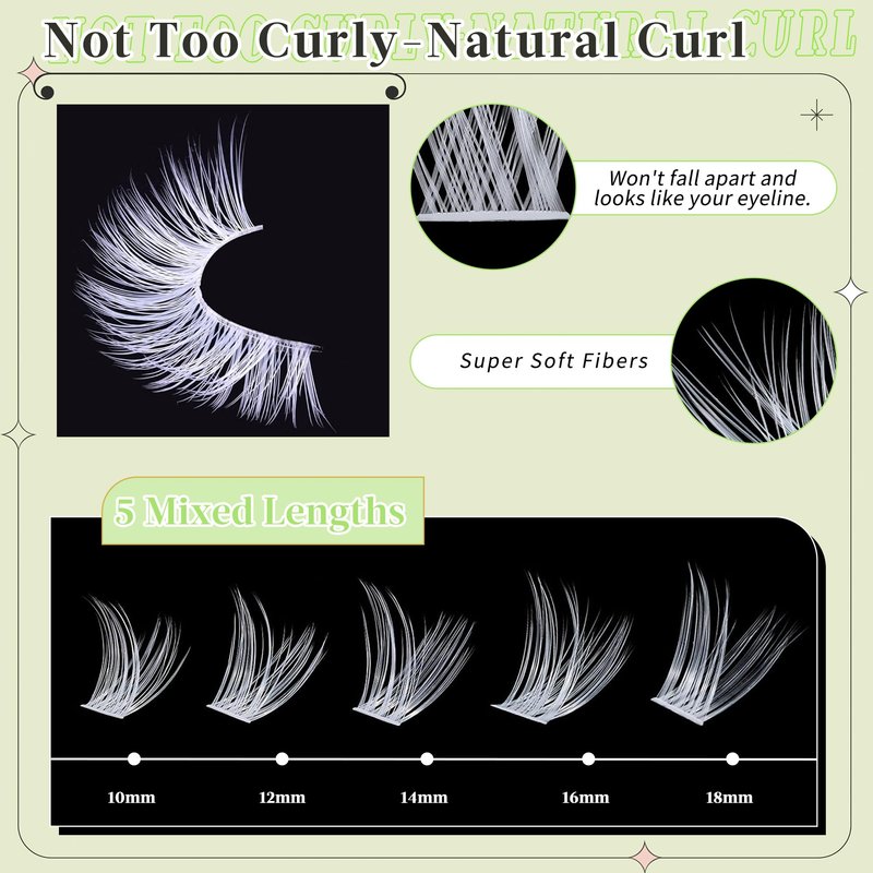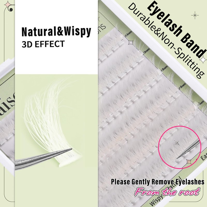 - 【Premium Cluster Eyelash Extension fibers】The ultra-fine cotton thin band better fit to your eyelids, thickness-0.05mm is lighter and softer than regular individual eyelashes fibers.Long lasting D curl wispy lashes and the cluster lashes are made of high-quality plant fibers with a natural sheen and a softness,matte white color