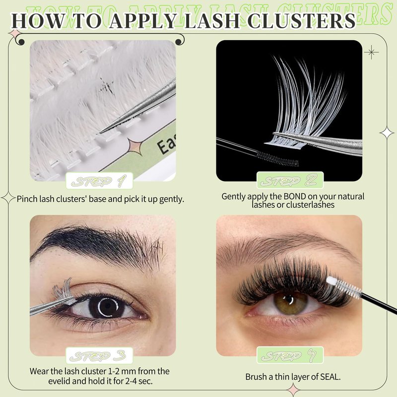 - 【Application Tips】1.Apply lash BOND on your natural eyelashes;2.place the lash clusters underneath your lashes;3.use lash SEAL brush to Lock. Beautiful makeup is complete!