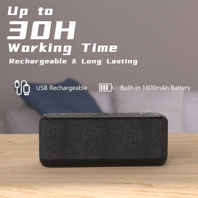- 🔋【Long-Lasting Battery Powered Sound Machine】-Equipped with an 1800mAh rechargeable battery, our upgraded sound sleep machine provides up to 30 hours playtime when fully charged by the included USB cable and adapter.No longer need to be near an outlet or change batteries constantly.A good companion for travel.