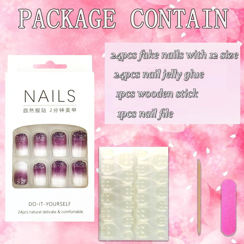 White Press on Nails Medium Square 24Pcs Artificial Glossy Fake Nails with Gradient Purple Glitter Designs Full Cover Coffin False Nails Glue Stick on Nails Fingernails with Charm for Women Girls