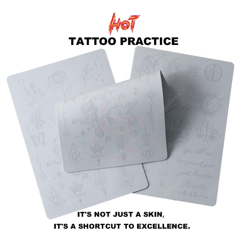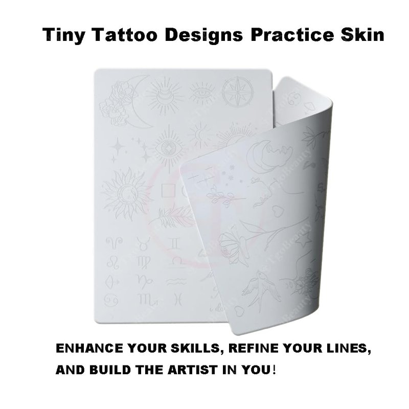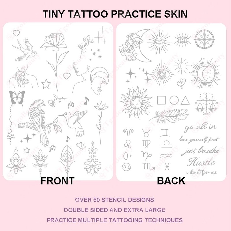 - Tiny Tattoo Practice Skin: the double-sided, easy wipe, fine line tattoo practice skins feature over 50 different stencil designs on the front and back of the skin.