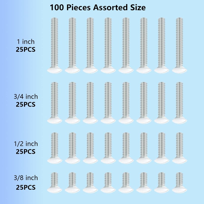 - 【Package Content】You will receive 100 pieces white wall outlet screws in 4 length sizes of 3/8'', 1/2'', 3/4''and 1'', 25 pieces for each size. Different sizes of screws make you get the job done fast to install your outlets or switch plate covers