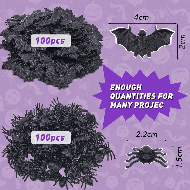 - Package Includes: You will receive 100 pcs 0.78/1.57 inches plastic mini fake Spiders and 100 pcs 0.59/0.86 inches mini 3D bats, sufficient quantity to meet your various decoration needs