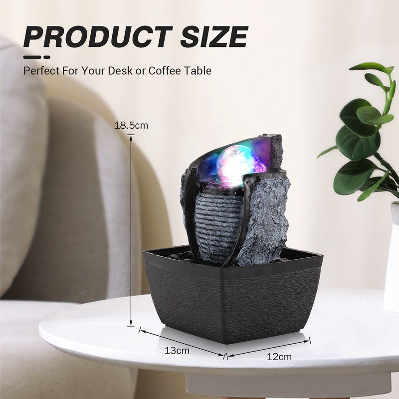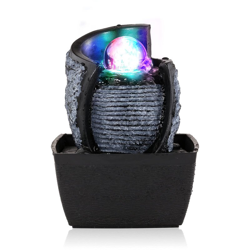 - Built-in LED Light: The rolling ball of fountain is lit by the LED lighting to offer a peaceful, calming glow. Crystal-like orb spins as water cascades down water tiers of stone-like layers creating a calming ambiance. Give your home or office a touch of style and serenity with this indoor water feature.