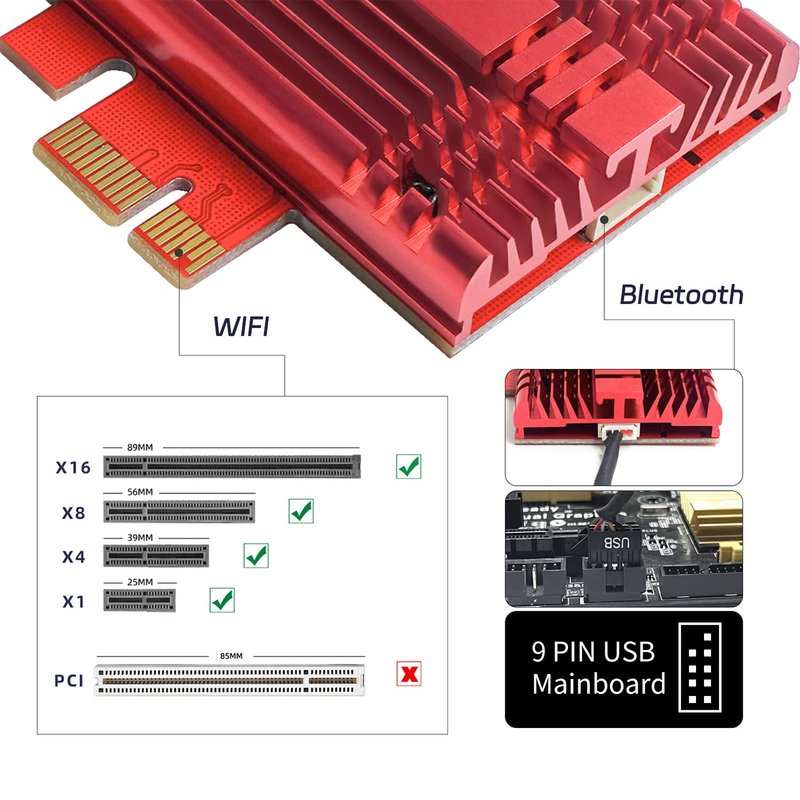 - 【WiFi 6E Support 6GHz】Wi-Fi 6e network card is a new type of wireless card that supports communication using the new 6GHz frequency band. It has higher bandwidth and less interference compared to traditional 2.4GHz and 5GHz frequency bands, providing better network performance.
