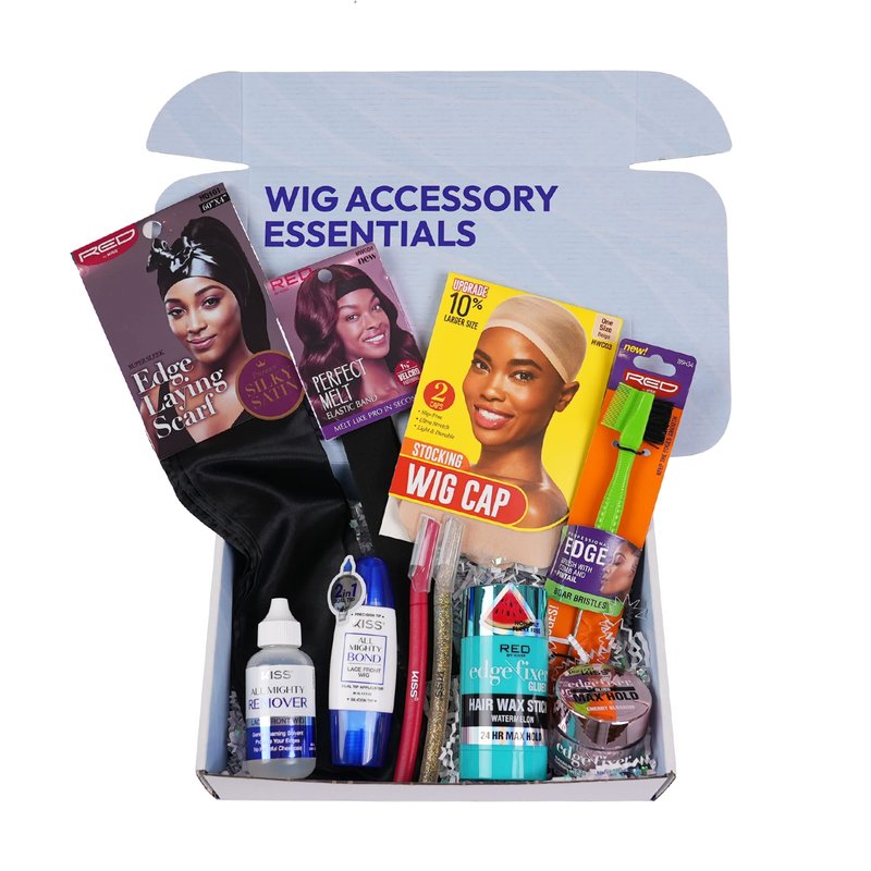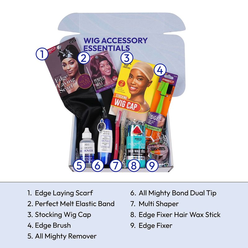 Wig Accessory Essentials Kit Included in Set: 1.Edge Laying Scarf - perfect for laying down edges & melting the lace frontals. premium silky satin feels gentle on hair and skin 2.Perfect Melt Elastic Band - perfectly melts lace frontals and keeps baby hair in place so your wigs can look as natural as you want. Adjustable with self-fastener and is soft and stretchy 3.Stocking Wig Cap - protect your natural hair. Slip-free ultra-stretch, light durable, and one size fits all 4.Edge Brush - style your edges with high-quality boar bristles. Comfortable grip with the texturized body. Rat tail pin tail end to help the styling hair 5.All Mighty Remover - excellent for taking off tape gently without pain and removing the glue easily from the skin and wig 6.All Mighty Bond Dual Tip - 2 in 1 tip for effortless attachment and touch-ups. Leak proof, No Mess. Compact & Portable and no other tools are needed. 7.Multi Shaper - conveniently trim unwanted fine hair at home. Blade guard allows for a smooth, clean cut 8.Edge Fixer Hair Wax Stick - Infused with Biotin B7, our Hair Wax Stick helps thicken and strengthen edges and hair. Long-lasting with maximum hold 9.Edge Fixer - Infused with Biotin B7 to help enhance and strengthen edges. It provides maximum hold, no flaking, high shine, and pigmentation