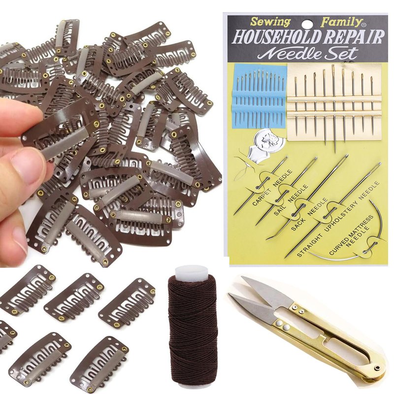 Wig Clips with Soft Rubber Hair Extensions Clips 32mm U-Shape Snap Comb Clips Hair Wig Clip Needles Thread Scissors Set for wig hair extensions (Dark Brown)