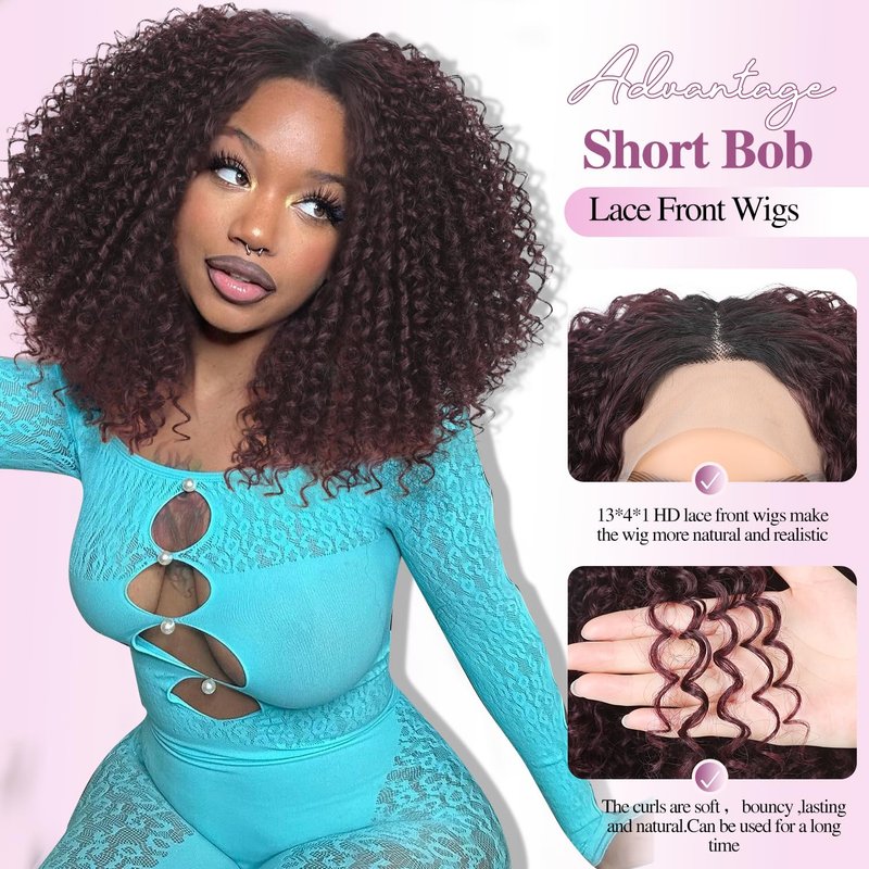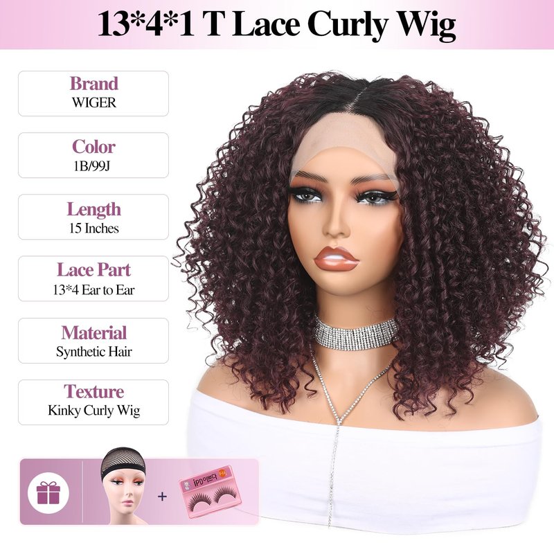 WIGER 15 inch Short Bob Lace Front Wigs Middle Part Wigs Curly T Part Wigs Ombre Afro Kinky Curly Wigs Synthetic Curly Wig For Black Women(1B/99J)