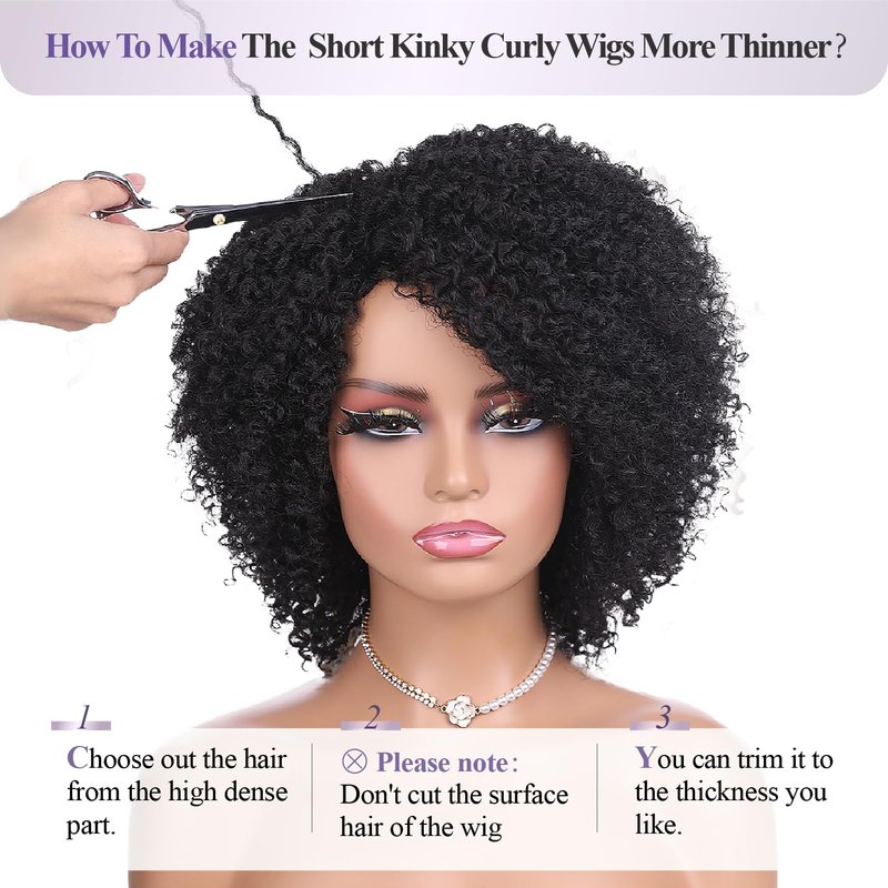 A1: You can trim high dense part of the short curly wig to the thickness you like. But do not cut the hair at the top of the wig. Finally, the kinky curly wigs become as beautiful as in the photo.