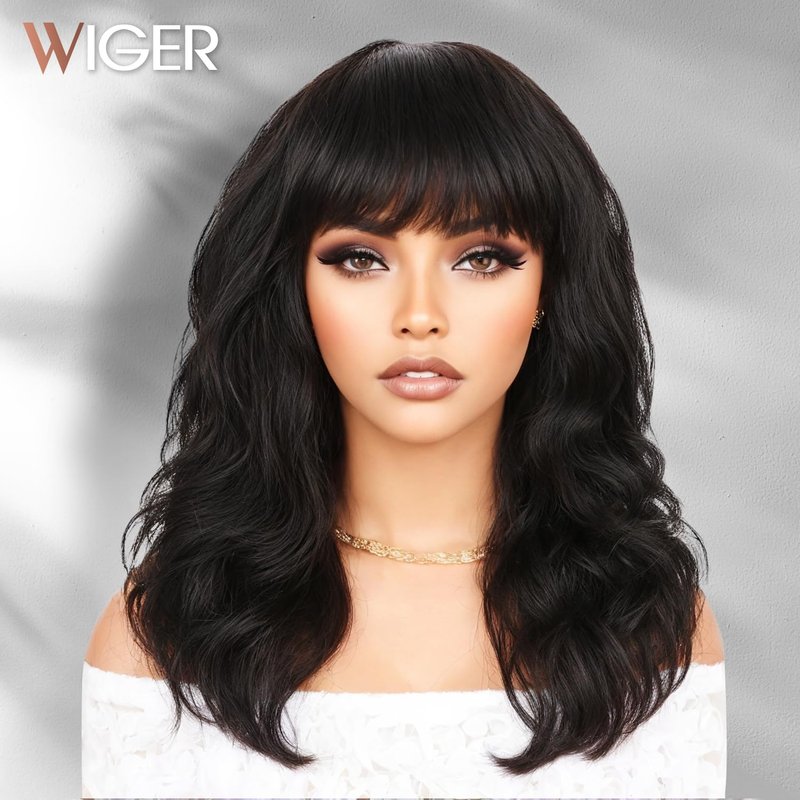 WIGER Curly Wig with Bangs Human Hair Black Nat...