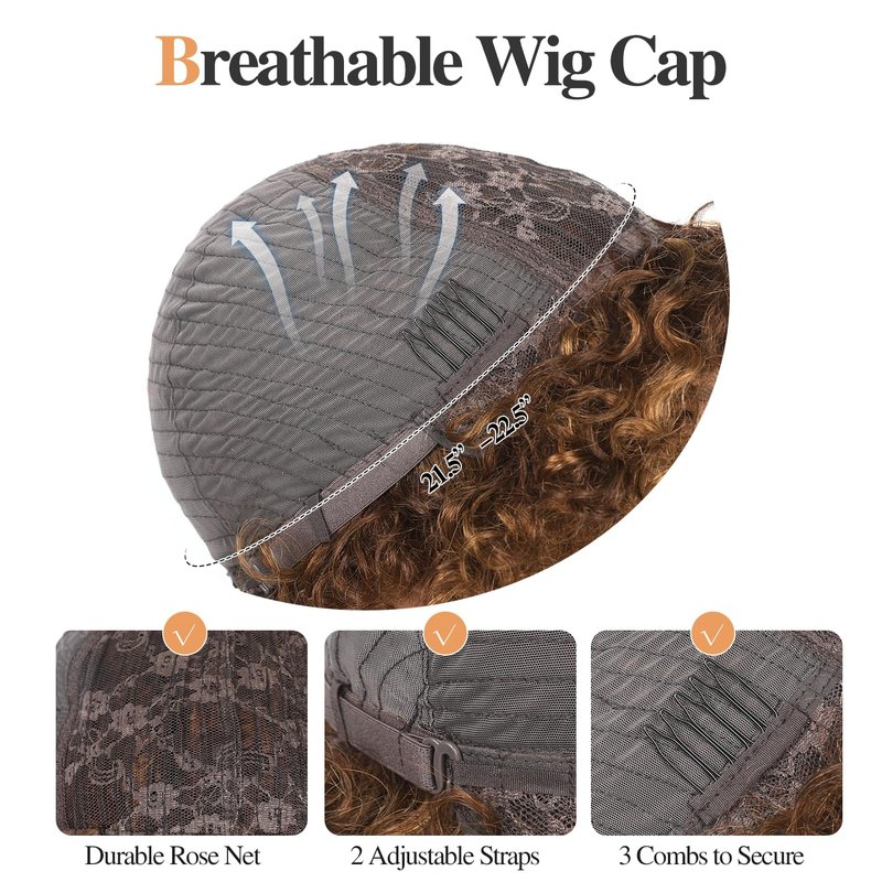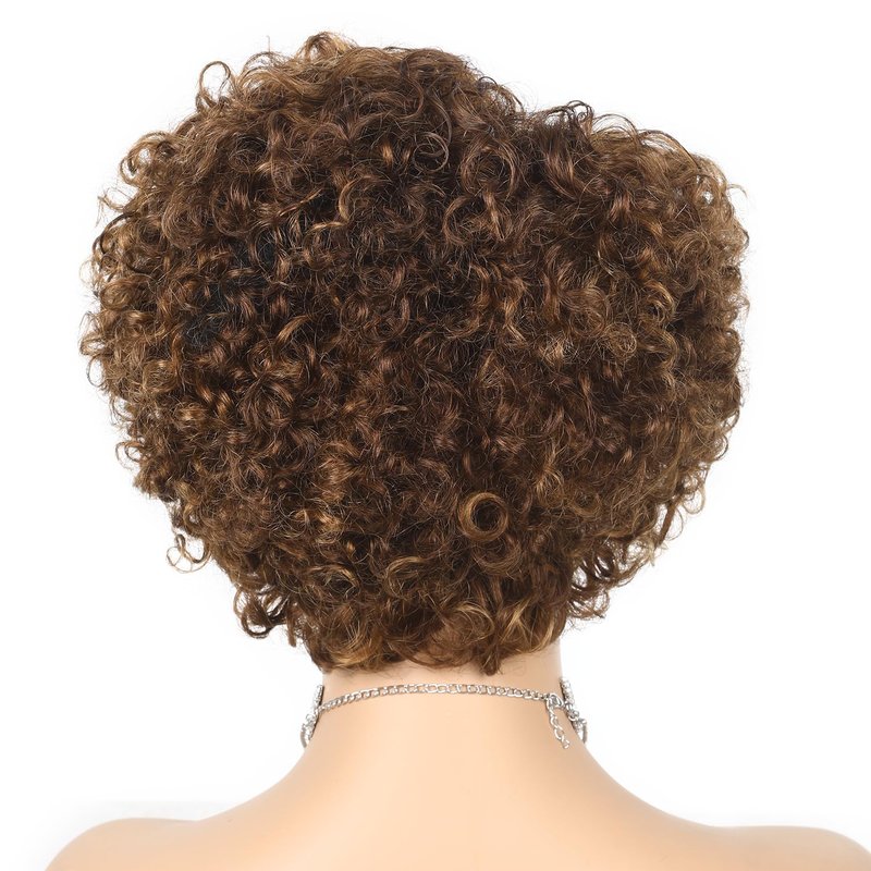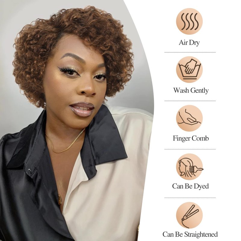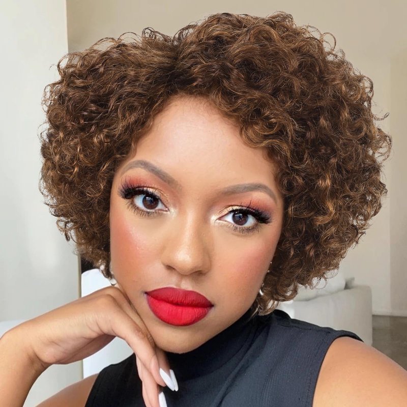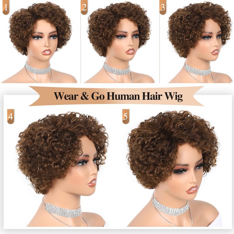 WIGER Glueless Side Part Kinky Curly Human Hair Wig Ombre Brown Short Curly Human Hair Wigs for Black Women Highlighted Natural Hairline Pixie Curly Bob Wig None Lace Frontal Deep Curly Hair