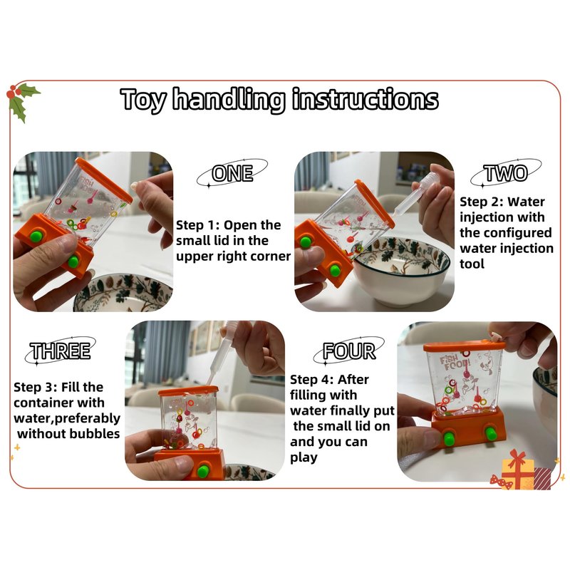 - Our water ring toss handheld game toys come in a variety of color and style combinations to give you freedom of choice.We have customized the exquisite packaging, including two exquisite and mini portable game toys. One is a water ring game handheld, the other is a new style of shooting basketball, they come in a variety of vibrant colors, including green, yellow, orange, and also come with a water injection gadget.