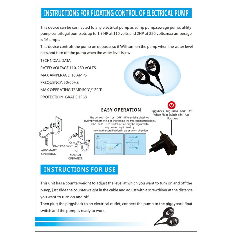 - JUST PLUG THE PIGGYBACK FLOAT SWITCH, THEN PLUG THE PUMP TO THE PIGGYBACK FLOAT SWITCH, ADJUST THE COUNTERWEIGHT AND YOU ARE DONE