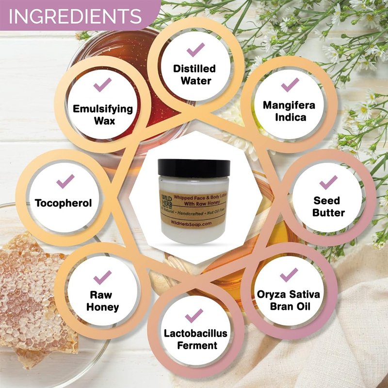 - WHIPPED HONEY LOTION - Whipped to a thick, creamy texture, our natural honey lotion glides on and soaks right in. Made with pure Arizona raw honey, you'll be amazed at the transformation of your skin. Packed with nutritious oils and mango butter, this rich, thick treat is Suitable for All Skin Types: Dry, Oily, and everything in between. Use on all ages from children to mature.