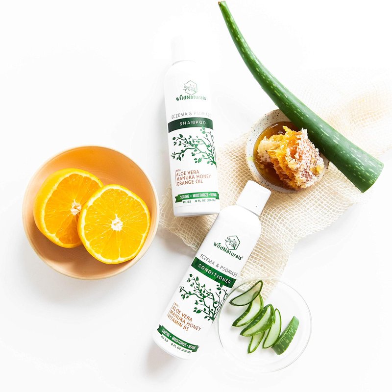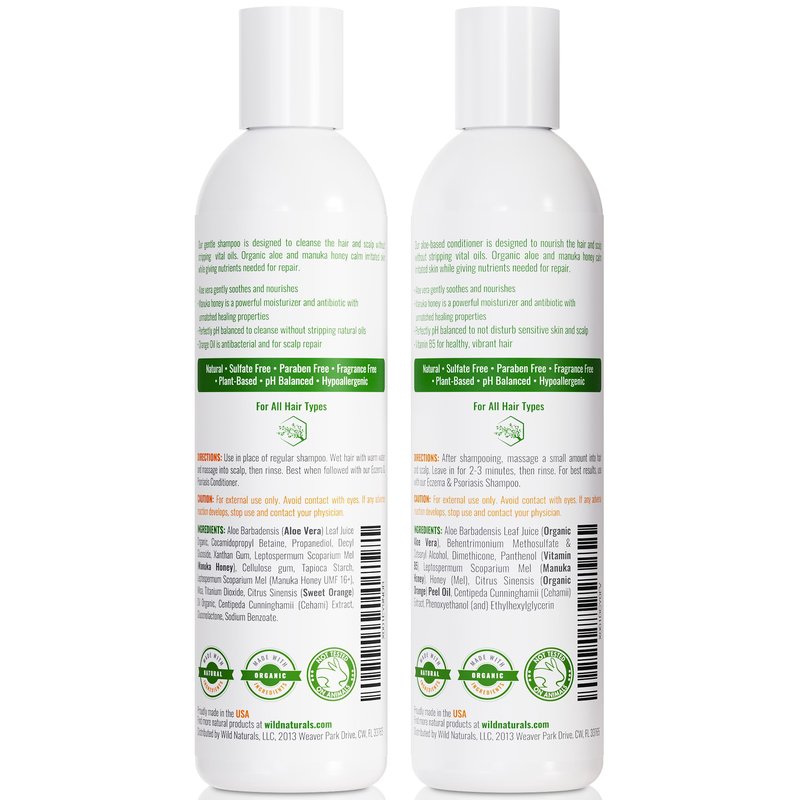 Wild Naturals Eczema & Psoriasis Shampoo & Conditioner provides soothing and nutrient-enriched relief from dry, irritated skin and scalp. This scalp psoriasis shampoo and conditioner also replenishes nourishing moisture, giving you rejuvenated, balanced, and healthy hair and scalp. Our dry scalp shampoo for psoriasis and seborrheic dermatitis scalp conditioner not only cleanses and removes dirt, oil, and impurities, but it also delivers an extra boost of hydration to nourish and protect your hair and scalp. Wild Naturals Eczema & Psoriasis Shampoo & Conditioner also prevents scalp dandruff, dryness, and itch. Infused with natural ingredients like Manuka Honey, Cehami, and Orange Oil, our shampoo for dry scalp and eczema scalp treatment conditioner gives your hair and scalp all the nutrients they need to keep them nourished and healthy. This shampoo and conditioner are made with concentrated aloe vera; no water is added. Our dry scalp shampoo and conditioner are pH-balanced, hypoallergenic, and free of sulfates, parabens, dyes, and artificial fragrances. Cruelty-free!