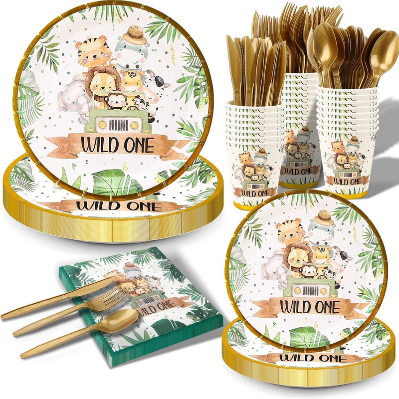 Wild One Birthday Decorations Tableware Set - Safari Party Supplies Include Plates, Napkins Cups Cutlery for Safari Animal Jungle Theme Wild One Party Supplies Deco | Serve 24