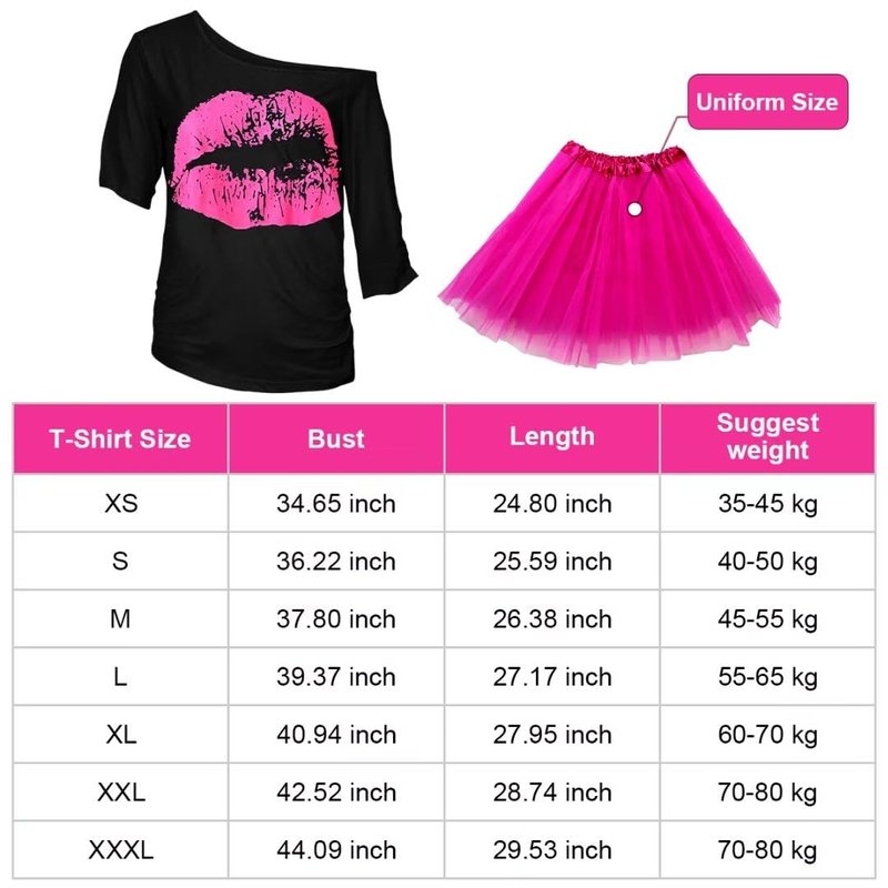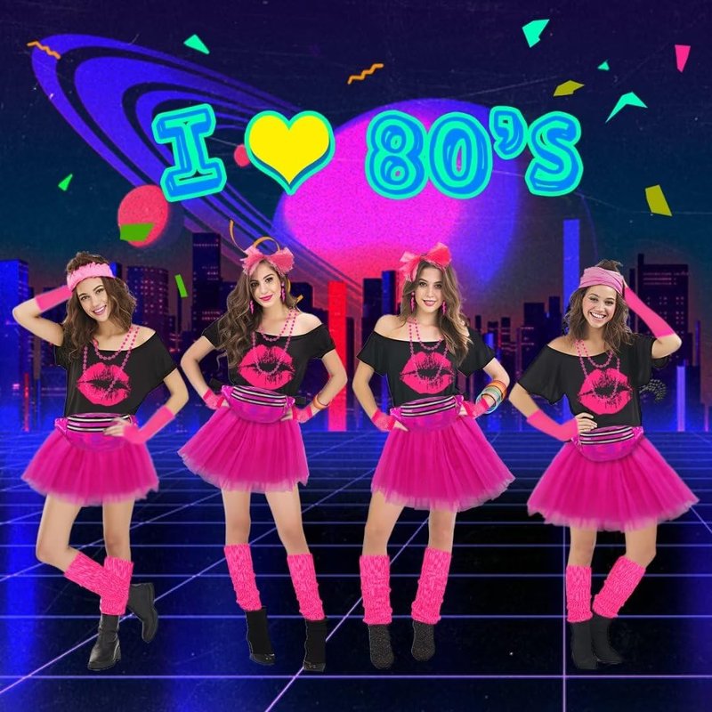 - 🍁Package Included 24PCS- 1 print T-shirt, 1 tutu skirt, 1 fanny pack, 1 pair of fingerless short fishnet gloves, 1 pair of fingerless long fishnet gloves, 1 pair of leg warmers, 2 neon necklaces, 1 lace headband,1 pair of flash earrings, 10 neon silicone bracelets, complete your demands on 80's costume accessories.