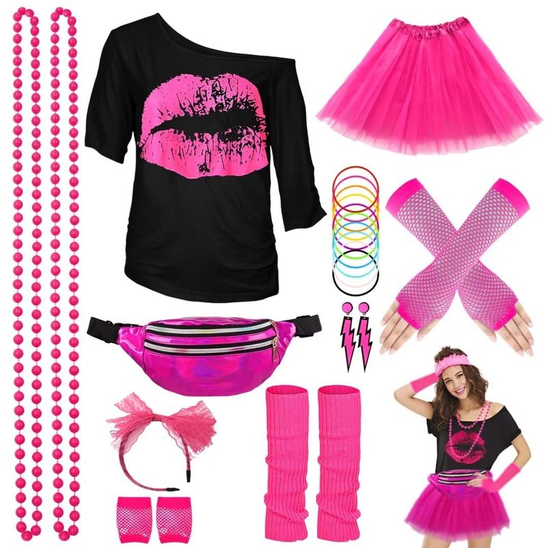 WILDPARTY Costume Accessories, T-Shirt Tutu Fanny Pack Headband Earring Necklace Fishnet Gloves Legwarmers 80s Party Halloween outfit for Women 24PCS (Pink M)
