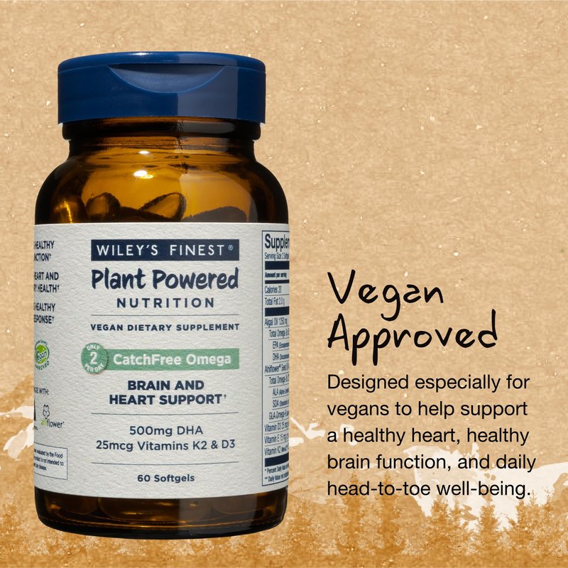 There’s no catch about the health benefits of Wiley’s Finest CatchFree Omega vegan omega-3 supplement. This omega-3 supplement is plant-based, providing the benefits of fish oil without using any fish. Made with algae oil, this omega-3s supplement supports a healthy heart and brain. Each serving contains 25 micrograms of vitamin K2, 25 micrograms of vitamin D3, and over 700mg of fish-free omega-3s. Helping meet the daily recommended intake of omega-3 fatty acids doesn’t have to include fish, it can just include two softgels of Wiley’s Finest Wild Alaskan Fish Oil CatchFree Vegan Omega-3 Supplement.