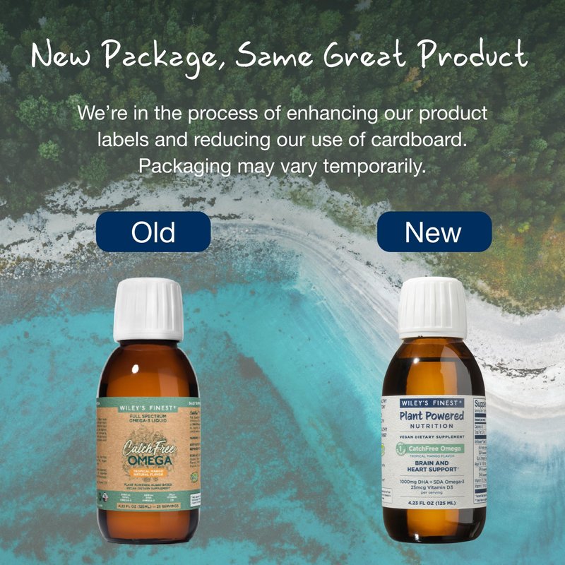 There’s no catch about the health benefits of Wiley’s Finest Wild Alaskan Fish Oil CatchFree Omega Liquid Supplement. This omega-3 supplement is plant-based, providing the benefits of fish oil without using any fish. Made with algae oil, this omega-3 supplement supports a healthy heart and brain. Each serving contains 25 micrograms of vitamin D3 and over 2300mg of fish-free omega-3s. Helping meet the daily recommended intake of omega-3 fatty acids doesn’t have to include fish—it can just include a teaspoon of Wiley’s Finest Oil CatchFree Omega vegan omega-3 liquid supplement.