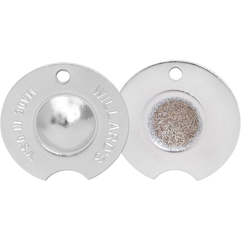 The Willard Cue Tip Shaper is designed to quickly and accurately reshape your cue tip to the perfect dime radius of 0.358 in. every time. With the Willard Shaper you'll be able to maintain a perfect and consistent curved dime radius necessary to accurately hit the ball. The carbon brazed steel grit on the inside of the domed shaped interior is designed to ensure a lifetime of reliable usage. The gauge design on the side of every Willard Shaper is made as a precise indicator in measuring the perfect tip shape. At a diameter of 1-1/2" the Willard Cue Tip Shaper is small enough to take with you on the go, and by using the punched hole on the side of the Willard Shaper you can easily carry your shaper on a key chain. By holding the Willard Dime Shaper in the palm of your hand and pushing the carbon brazed steel grit down on the cue tip of your cue moving the shaft of your cue back and forth in a clockwise and counterclockwise motion you'll be able to quickly return your cue tip to the perfect dime radius. The gauge on the side indicates the perfect dime radius is achieved when no light passes through the crescent gap between the Willard and your cue tip.
